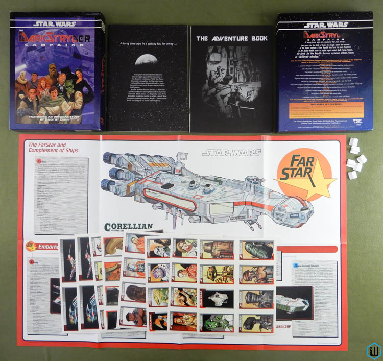 Contains: "Strikeforce: Shantipole" & "Starfall" & "Game Chambers of Questal." 1998 ... 128 pages ... WEG 40165 ... ISBN 0874315115 Check Wayne's Books Inventory ![]() DarkStryder Campaign![]() ![]() ![]() The DarkStryder Campaign [BOX SET] West End Games made some nice departures in style for the DarkStryder campaign. * The players are encouraged to use the characters included with the set, indeed each player will have a stable of characters to run, depending on the needs of the story. * The atmosphere is darker than the usual Star Wars setting. A short story by Timothy Zahn starts off the campaign, and helps set that tone. * The PC's ship, the FarStar, is a CR90 corvette with a colorful past, and a busy future. It's a run-down ship; malfunctions, repair, and constant maintenance will figure into the story. The crew is a dour, cranky lot. * All this is in service of running down imperial warlord Moff Sarne, the ultimate goal of the campaign. Many more photos of this set over at my Game Gallery: DARKSTRYDER Campaign Set (1995): Star Wars RPG gritty and dark long before Rogue One -Wayne A stand-alone campaign set in the early New Republic in the remote Kathol Sector. Includes: * 96-page Campaign Book * 96-page Adventure Book * Character (48) & ship (8) cards * a full color-map of the modified Corellian Corvette FarStar. 1995 ... WEG 40209 ... ISBN 087431254X Check Wayne's Books Inventory ![]() The Kathol Outback