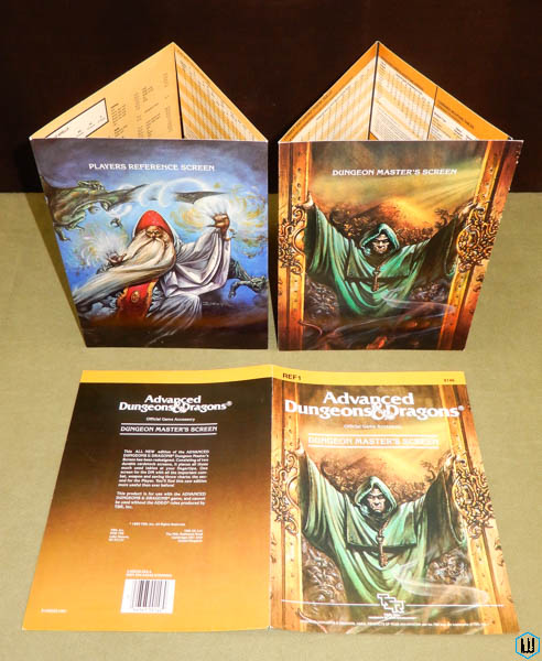 "The powers of the mind add a new dimension to any AD&D campaign. With the Deck of Psionic Powers, psionicists and wild talents alike have easy access to their mental abilities. This deck features 288 cards, including all of the psionic powers from The Complete Psionic Handbook and two DARK SUN accessories: Dragon Kings and The Will and the Way. Each card contains pertinent statistics and quick-reference details that make it easy to use every power. There is also a complete set of attack and defense mode combat cards to help players and Dungeon Masters alike visualize the incredible world of psionic combat. Whether your playing a psionicist in a DARK SUN campaign or a wild talent in another AD&D campaign setting, the Deck of Psionic Powers give you a mental edge on the competition." 1994 ... 288 cards + 5 blanks ... TSR 9458 ... ISBN 1560769025 Check Wayne's Books Inventory ![]() Screens![]() Dungeon Masters Screen (1st Edition) Earlier printings (with the first cover style) were published as a 2-panel screen and a 4-panel screen. Later printings went with a 3-panel/3-panel format. See my reference post: AD&D 1e Gold DM Screens: A Visual Guide to Printings. -Wayne "This second edition of the Dungeon Masters Screen has been redesigned for better clarity and quicker reference. This package consists of two durable, 11" x 25", folding cardstock screens for the DM's reference in playing ADVANCED DUNGEONS & DRAGONS games. One screen contains the Combat and Saving Throw Tables and the other contains the Psionic Combat Tables and miscellaneous information. These screens are useful for shielding maps and other game materials from the players when placed upright, and also provide instant reference to the charts and tables most commonly used during play. The player's side is printed with Experience Tables and the Weapons Table as well as being colorfully illustrated. These folders have been varnished on both sides to protect tham against common wear and tear. This (and only this) screen contains all the official AD&D statistics and tables." 1979, 1981 ... 2 screens ... TSR 9024 ... ISBN 0935696628 / 0394515773 Check Wayne's Books Inventory ![]() ![]() Dungeon Master's Screen - REF1 (1st Edition, revised) A new updated screen intended for the re-covered 1st edition books. Cover sheet contains class abilities and prerequisites. -W "This ALL NEW edition of the ADVANCED DUNGEONS & DRAGONS Dungeon Master's Screen has been redesigned. Consisting of two durable cardstock screens, it places all those much used tables at your fingertips. One screen for the DM with all the important combat, weapon and saving throw charts; the second for the Player. You'll find this new edition more useful then ever before!" 1985 ... 2 three-panel screens + cover sheet ... TSR 9146 ... ISBN 0880382244 Check Wayne's Books Inventory ![]() Dungeon Master's Screen (2nd edition)