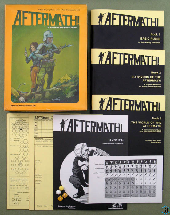 Waste World BROWSE MY AFTERMATH ITEMS CURRENTLY IN STOCK ![]() Aftermath! "The sun hangs low on the horizon illuminating the ruins of civilization with a bloody light. Is it the sunset of the earth or the sunrise of a brave new world? You can decide as you boldly stride the rubble strewn streets of the AFTERMATH...The Game is for 2 to 6 players and a referee in search of a different kind of adventure. It is a role-playing excursion into a post-holocaust world. The Players create characters, designed by themselves, to face the challenges and dangers of life after things fall apart. The Referee is provided with everything he needs to detail the world in which the players will adventure. Aftermath! is not a game for the faint at heart. Ruined cities, dread diseases, despair and broken dreams are a part of the characters' daily lives. Still hope survives, for mankind still survives. Rise up, meet the challenge and overcome! Aftermath! contains: Basic Rules book with multiple examples and illustrations of play. Players' Handbook detailing construction of characters, equipment and life after the Ruin. Referee's Handbook detailing construction of the environment and running the game. Introductory Scenario to allow you to start play easily. Aftermath! provides a solid basic play mechanic that has been over 2 years in playtesting. Rules are provided for modern firearms, NBC weapons and protections, mutations, survival, high technology and more. The game is structured to allow the referee to decide the nature of the holocaust that destroyed the world in which play will occur. Aftermath! is a step forward in the art of role-playing games." 1980, 1981 ... Robert Charrette & Paul Hume ... Phoenix Games / Fantasy Games Unlimited (FGU) 4000 Classic Box Set: Amazon | Paperback reprint: Amazon ![]() ![]() Aftermath (restickered Phoenix Games edition) with reprint paperback. EDITIONS: Aftermath was in print for quite a long time. I detail them thoroughly over at my game blog: Aftermath RPG (1980-1): Phoenix & FGU Editions -Wayne ![]() ![]() Into the Ruins: The City of Littleton (Scenario Pack 1) "This scenario pack is intended to provide a group of players with a starting place for a campaign using AFTERMATH! This scenario package consists of a map of Littleton, an average American city, updated to the current status of the city, and several detailed descriptions and maps of various areas in and around the city. Some areas are not detailed because they are left for the Gamemaster. He may flesh them out as he desires to fit the city into his campaign structure. Each subsection of the scenario package is dealt with separately and a Gamemaster may utilize what he wishes from each. The diversity is intended to present a sampling of possible adventures in an AFTERMATH! World." 1981 ... Bob Charette & Paul Hume ... 28 pages ... FGU 4001 Check Wayne's Books Inventory ![]() Operation Morpheus: The Ruins of the University (Scenario Pack A1)