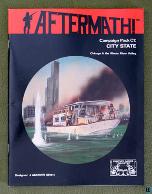 CITY STATE: A drop-in Chicago Sourcebook for your T2000 campaign "CITY STATE is designed as a campaign introduction to an AFTERMATH world. It forms the beginning of a campaign set in Chicago and the Illinois River Valley - although the information contained herein could potentially be used to set a campaign along any river open to navigation. The situation presented herein includes the political situation within the city of Chicago and the current City State based in the mid-western city. It also includes the political and social structure along the river valley that serves as an avenue for both trade and expansion of the growing City State. It is along this network of waterways that the City State comes into contact and growing friction with its neighbors. In addition to the campaign background and data on the various communities in the city proper and along the river, CITY STATE also includes introductory adventure material to get a campaign started in this setting." 1987 ... J. Andrew Keith ... 64 pages ... FGU 4007 Check Wayne's Books Inventory ![]() Aftermath Technology