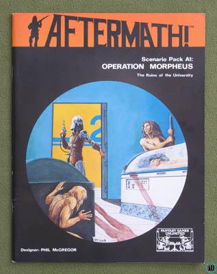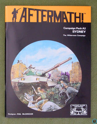 "OPERATION MORPHEUS is designed as a campaign introduction to an AFTERMATH! world. Although originally part of a campaign set in Australia the information and ideas herein can easily be used with any campaign. The setting is a major university in an important city. The time is approximately one hundred years after the collapse of civilization. The players take the parts of people who, having volunteered to take part in a 'short-term' experiment in cryogenic suspension, awaken many long years after the planned time. They find the world in ruins and have no idea of the cause of, reasons for or history of this disaster. Naked and unarmed they must face a strange new world. Cleverness and quick thinking are the first steps to survival. OPERATION MORPHEUS is not a complete game but a background package for use with the AFTERMATH! game system. AFTERMATH! Is required for play." 1982 ... Phil McGregor ... 56 pages ... FGU 4003 Check Wayne's Books Inventory ![]() Sydney: The Wilderness Campaign (Campaign Pack A2)
