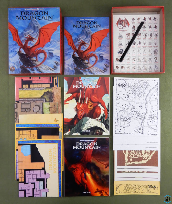 < ![]() ![]() Dragon Mountain [BOX SET] There are at least two distinct printings of this set. The earlier printing (1993, with TSR rectangular gold badge) displays (on the back of the box) the content item count is erroneously claimed as 12 cards, 16 handouts (actual count is 14 & 14.) But there is also a folded poster of the cover art by Paul Jaquays in the first print set. The 2nd printing (TSR round gold badge logo; states July 1994 on back of box) correctly claims 14 cards, 14 handouts on the box rear [physical count confirmed]. The poster is not present in this printing. -Wayne "The ultimate DUNGEON MASTER fantasy! This is the most deluxe dungeon, designed to appeal to discriminating and demanding role-players. Adventurers, beware. This is more than just a dragon hunt. Within the lair of this beast lie cruel and and deadly traps, befuddling conundrums and puzzles, and cunning minions that will be the end of overconfident or careless adventurers." Inside this box there are (with my notes): * Three 64-page books, comprising two adventures that link into one super-campaign The books are not named. Book 1 (1089XXX1901), Book 2 (1089XXX1902), and Book 3 (1089XXX1903). * 14 full-color reference cards [cardstock] Map 1A, Level 2 Map 1B, Level 2 Map 1C, Level 3 Map 2 Map 3 Map 4 Map 5 Map 6 The Under-Mines Warriors of Winter Dwarven Burial Chamber DM Map to Dragon Mountain Amulet of Dragon Warding Art showing entrance * 14 special player handouts [stationery-grade paper] Handout 1: Letter about the weapon Chyrithis Handout 2: The Journal of Ferenik Stonefist (4 sheets) Handout 3 Handout 4 Handout 5 Handout 6 Handout 7: Job offer letter Players' Map to Dragon Mountain Handout 9: Letter to Dragon from village Handout 10: Letter to Harixis from Nasagan Handout 11 * Eight Monstrous Compendium sheets (Brain Spider; Dragon-kin; Dwarven Undead; Earth Weird; Fiend, Water Lord; Living Steel; Gnasher; Gnasher, Winged; Kobold, Dragon Mountain; Noran; Ophidian; Rautym; Squeeker; Stone Snake; Suwyze) * A sheet of (48) cardstock standups with 24 plastic bases * Six full-color poster maps, two of which link together to make a giant tactical playing surface for use with miniatures or the included cardstock figures. All single-sided posters. 1089XXX0701 Battle Map 1 1089XXX0702 Battle Map 2 1089XXX0703 Dungeon Level 1 1089XXX0704 Dungeon Level 2 1089XXX0705 Dungeon Level 3 1089XXX0706 Dragon Lair Tactical Map 1993 ... Colin McComb & Paul Lidberg ... TSR 1089 ... ISBN 1560765984 Check Wayne's Books Inventory ![]() Cardmaster Adventure Design Deck [BOX SET]