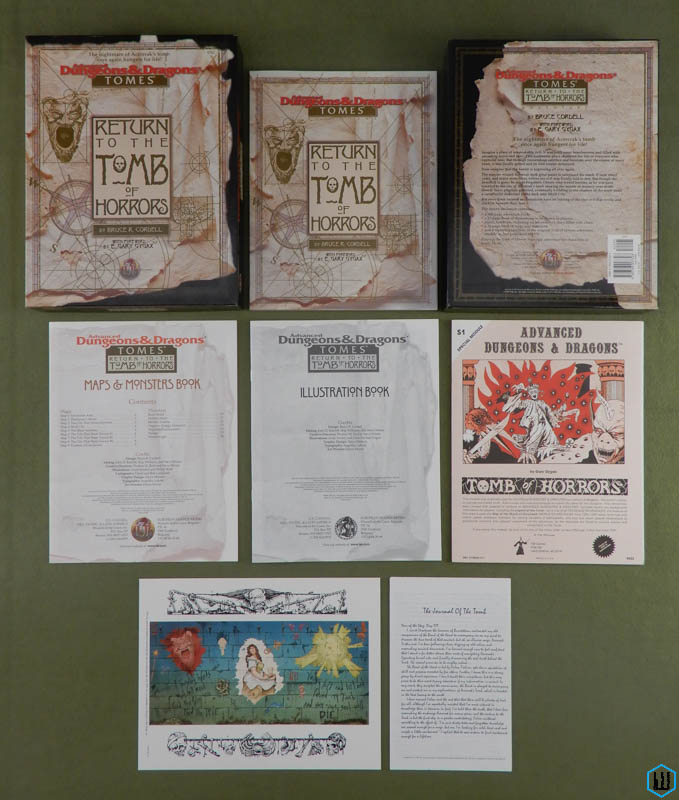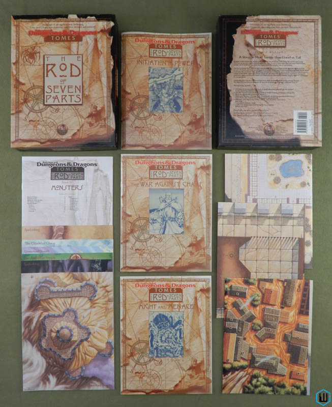 The Big Yellow Box 1996 ... TSR 1167 ... ISBN Noble Knight | DriveThruRPG (PDF) ![]() ![]() Night Below: An Underdark Campaign [BOX SET] Be sure to visit my Night Below blog page. Lots of photos! "Night Below, the first epic campaign adventure for the AD&D game, is designed to take the player characters from 1st level to 10th level and beyond. The PCs start as beginning adventures on a routine courier mission who soon become drawn into combating a sinister plot that menaces the pleasant land of Haranshire. By the end of Book I, The Evils of Haranshire, the player characters should have worked their way up to 5th level. Book II, Perils of the Underdark, shifts the scene underground as the characters search the seemingly endless realm of the underdark to discover the fate of the kidnappers' victims. By the time they reach the dark cavern of The Sunless Sea in Book III, they should each be 10th level or above, ready at last to confront the ultimate evil behind the far-reaching conspiracy. Inside this box are * Three 64-page books compromising a single grand-scale adventure, which can be placed in any AD&D world. * 16 Player Handout sheets featuring art, maps, charts, and letters. * 8 two-sided DUNGEON MASTER Reference Cards providing cutouts, monster rosters, and two new evil deities. * An eight-page booklet of new MONSTROUS COMPENDIUM entries, detailing three new races and two new monsters. (Aboleth, Savant; Elf, Rockseer; Ixitxachitl, Ixzan; Eel, Giant Moray; Golem, Shaboath) * 6 full-color poster maps detailing all the important locations in the entire campaign setting." The "six" poster maps are actually 3 double-sided maps. -W 1995 ... Carl Sargent ... TSR 1125 ... ISBN 0786901799 Check Wayne's Books Inventory ![]() ![]() The Rod of Seven Parts (Tomes) [BOX SET] "Imagine a time before the words Good and Evil had meaning, a day when the world was young. Discover an ancient conflict that predates the stars. It was in these days that Law and Chaos forged worlds out of nothingness; their war began while the cosmos was yet unfinished. The Rod of Seven Parts defines epic role-playing. The reappearance of the Rod has awakened the powers of Chaos, and their queen seeks to turn the whole world into a battleground. Bold heroes must undertake the enormous task of seeking out and assembling the pieces of the Rod, but even its power cannot stand alone. Ages ago, primal forces of Law stood fast against Chaos; now their champions must once more confront the Queen of Chaos and her foul spyder-fiends, lest the flame of civilization be extinguished. Follow the quest for the capricious Rod as it leads characters on a journey of high fantasy. The Rod of Seven Parts is designed for four to six heroes and heroines of levels 10 to 12. This boxed set includes: * Initiation to Power, a 96-page book of grand adventure playable in any AD&D world, including original campaigns; * The War Against Chaos, a 64-page book of world-crossing adventures pitting PCs toe to toe against the minions of Chaos; * Might and Menace, a 32-page book detailing the mysterious powers of the Rod of Seven Parts: how it affects both its enemies and its friends; * Monsters, a 16-page book of new villains, new monsters, and even a new race! * 6 two-sided reference cards; * 3 double-sided, full-color poster maps portraying the key locations heroes can visit. Read about this ancient artifact in the epic novel The Rod of Seven Parts by best-selling author Douglas Niles!" 1996 ... Skip Williams & Jim Roslof (art) & Erol Otus (art) ... TSR 1145 ... ISBN 0786904186 Check Wayne's Books Inventory ![]() ![]() Return to the Tomb of Horrors (Tomes) [BOX SET] An update to the classic adventure by Gary Gygax. I've posted a full pictorial unboxing of the set over at my Game Gallery blog -Wayne "Imagine a place of unspeakable evil. It was built upon hopelessness and filled with unending terror and pain. This loathsome place shattered the life of everyone who ventured near. But through tremendous sacrifice and heroism, over the course of many years, it was finally gutted and its foul creator destroyed. Now imagine that the horror is beginning all over again. The sinister wizard Acererak took great pains to safeguard his tomb. It took many years, and many more lives, before his evil was finally laid to rest. But though the demilich is gone, he is not forgotten. Others who would become as he was have traveled to the site of Acererak's tomb seeking the secrets of mastery of death. Slowly these pilgrims gathered, eventually building in the shadow of the tomb itself a community dedicated to the dark arts: Skull City. But even these twisted necromancers have no inkling of the true evil that swells and crackles beneath their feet. This boxed adventure contains: * a 160-page adventure book; * a 32-page book of illustrations to be shown to players; * player handouts, including an adventurer's diary filled with clues; * a 16-page book of maps and monsters; * and a reprinted facsimile of the original Tomb of Horrors adventure module as first published in 1978. Return to the Tomb of Horrors is an epic adventure for characters of levels 13-16." 1998 ... Bruce Cordell & E. Gary Gygax (foreward) ... TSR 1162 ... ISBN 0786907320 Check Wayne's Books Inventory ![]() Core Rules CD-ROM Core Rules 1.0 (CD-ROM)