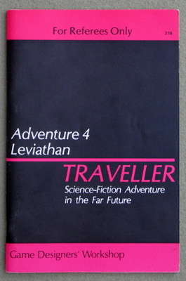 "From a clue in an old worn book, from a rumor in a starport bar . . . the adventurers are led across the sector in pursuit of a century-old treasure worth millions. Meanwhile, unknown to anyone, the secret of Twilight's Peak is not a fortune, but death, and death in unexpected ways." 1980 ... 64 pages ... GDW 314 Check Wayne's Books Inventory ![]() Adventure 4: Leviathan