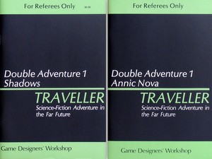 "Signal GK the Vilani interstellar distress signal. When starships are in trouble, they use it like SOS or Mayday. Now Travellers can embark on an adventure through the Solomani Rim, and never be sure when they will hear the signal, or need to send it" 1985 ... Marc Miller & J. Andrew Keith ... 48 pages ... GDW 341 Check Wayne's Books Inventory ![]() Double Adventures Double Adventure 1: Shadows / Annic Nova