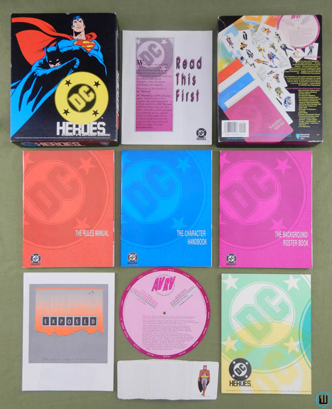 Want to check your set for completeness? Lots of pics of DCH 1e. DC HEROES RPG 1e (1985): Card Photos and Reference Contents: Quick Start Rules; Titan's Challenge book; Player's Manual; Gamemaster's Manual; Powers & Skills book; Gamemaster's Screen; 30 character cards; 39 stand-up character counters; 12 plastic stands. 1985 ... MAY 201 ... ISBN 0425066339 Check Wayne's Books Inventory ![]() ![]() DC Heroes Role-Playing Game, 2nd Edition [BOX SET] "Fly through the skies above Metropolis as the mighty Superman. Put your outstanding detective skills to the test as Batman and outwit the evil Joker. Battle the powers of evil throughout the world and beyond as a member of the mighty Justice League International. Imagine it and live it with the DC HEROES Role-Playing Game. Your imagination is your guide to exciting adventures for your favorite DC Comics Characters. Or, create your own heroes to battle against the evil plots of sinister villains. Everything you need to become a part of the DC Universe is yours with the DC HEROES Role-Playing Game. The DC HEROES Role-Playing Game includes: • Read This First! booklet, with a Batman solitaire adventure • The Rules Manual • The Character Handbook • The Background/Roster Book, including game statistics for over 250 characters and featuring essays by Robert Greenberger, Jack Kirby, Robert Kanigher, Neil Gaiman, Dan Jurgens, and Roger Stern • Full-length JLI Adventure: Exposed. • Action Wheel • Full-color Gamemaster's Screen • 75 Illustrated Character Cards, featuring Justice League America, Justice League Europe, the New Titans, the Suicide Squad, Watchmen, and more! • 2 Ten-Sided Dice." The character cards were issued with 3 blanks, in addition to the 75 printed cards. Visit my game blog for a closer look at the cards: DC Heroes RPG 2e (1989) Card Photos and Reference I found a 1991 Mayfair catalog in a set, giving an idea of the length of this set's print run. -Wayne 1989 ... Mayfair Games (MGI) 245 ... ISBN 0923763023 Check Wayne's Books Inventory ![]() DC Heroes Role-Playing Game, 3rd Ed.