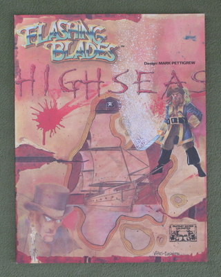 "The first adventure pack for use with FLASHING BLADES. Included in this package are four complete adventures and several bonus sections. Herein can be found: • THE FENCING MASTER: A complete adventure involving fencing schools and their rivalries, as well as a rescue mission to the south of France. • THE GRAND THEATRE: A complete adventure built upon espionage and the influence of powerful figures, all compounded by the rivalry between King and Cardinal and between the King's Musketeers and the Cardinal's Guard. • THE GREAT MARKSMANSHIP TOURNAMENT: An adventure of pomp and ceremony during the official celebrations marking French military victories with subplots of intrigue and danger. • SCAVENGER HUNT: A humorous quest through the streets of Seventeenth Century Paris, interspersed with typical encounters in a major city. • EXOTIC ITEMS: A new section on exotic and interesting items that were becoming popular of fashionable in Paris during the Seventeenth Century. • A GUIDE TO PARIS: A view of Paris in the Seventeenth Century discussing major buildings and their functions, neighborhoods and backgrounds. • THE RUMORMILL: A source of rumors for any campaign to use as a starting point for many adventures or to add subplots of overall background to an adventure in progress." 1985 ... Mark Pettigrew ... 30 pages ... FGU 2102 Check Wayne's Books Inventory ![]() High Seas