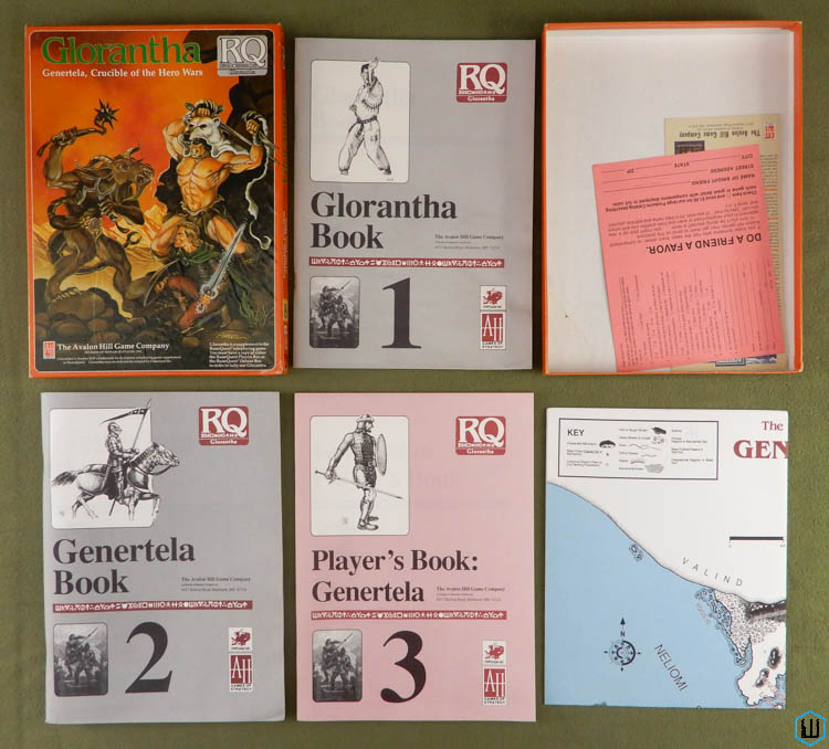 "The year is 1100 AD... You are brave samurai skilled warriors in the employ of Lord Uesigi Toshimichi, You escort his nephew, Tametaka, on a diplomatic mission into unfriendly Suruga province, Controlled by the powerful ShikI clan, Lord Uesigi's foes have long disputed his control of Totomi province. After several days, while awaiting the return of Tamataka from a meeting with the Shiki lord, you awaken to a soft crash issuing from nearby bushes. A quick search reveals the body of a comrade, one of the Uesigi samurai dead of terrible wounds, fn his outstretched hand, scrawled in his own blood, are blurred characters on a strip of paper: "Treachery. . . Tametaka slain . , . troops . . . Shiki. . ." You have failed to protect Lord Uesigi's nephew. This is a terrible disgrace and a stain upon your honor. You must decide upon a course of action to clear your name. Will you attempt to avenge him? Anyone making such an attempt should be wished better karma in the next life, because a dozen men storming a castle is suicide. Do you commit seppuku to atone for the failure? This course expiates your breach of loyalty, but of itself is another breach of loyalty to Lord Uesigi. Do you choose the wisest course warning Lord Uesigi of the Shiki treachery? You must escape the hostile territory and travel back to Uesigi's castle. Even if you succeed, you may still have to commit seppuku to atone for the death of the nephew. Land of Ninja is a RuneQuest supplement set on Earth. The gamemaster can choose to introduce only historical elements into his Ninja campaign or he can add the gods, spirits, and monsters from Japanese legend to create a fascinating blend of history and myth. Land of Ninja Includes: Players Book character generation notes, pronunciations, names, occupations, new skills, Japanese ships, notes on Nihon, Samurai society, Ninja, personal virtues, elements of Bushido, Honor, the obligations of Giri, social structure, Irving conditions/ customs, Japanese religion and magic, glossary. Gamemasters Book the Nihonese world, an adventuring history, Ki skills, notes on civilization, creatures, comprehensive reference list. Scenarios Book planning a campaign, suggested campaign, The Hatamoto's Illness. Play Aids map of Nihon, master Nihon character sheet" 1986 ... Bob Charrette & Sandy Petersen ... RQ7 / AH 8584 ... ISBN 0911605339 Check Wayne's Books Inventory ![]() ![]() Glorantha: Genertela, Crucible of the Hero Wars [BOX SET] "ALL ACROSS THE VAST CONTINENT OF GENERTELA, prophets, priests and madmen speak of imminent war, of a new and cataclysmic conflict that will inflame all the lands and threaten all established powers. The leaders in this coming series of wars will be heroes and even demigods, bearing awesome and terrifying magic from beyond the earthly plane. Already the first events of the Hero Wars have come to pass in such lands as Maniria, where the once proud Holy Country has been defeated in battle, its lands and cities isolated or conquered, and its leader, the Pharaoh, lost to the knowledge of men. In villages, forts and cities of every land in Genertela, brave men and women are preparing themselves for war, and questing for magic to aid in their survival should the prophesied conflicts ensue. This supplement provides a complete background for campaigns set in the first phase of the Hero Wars of Glorantha. All the lands of Genertela are examined, and current events and personalities of importance to the Hero Wars are outlined. CONTENTS: Glorantha Book: An overview of the most important aspects of the world of Glorantha. The Editor's Introduction takes a look at such points as daily life in Glorantha, and the adventurer's role in this world. The Six Worlds of Glorantha discusses the God Plane and Hero Plane of Glorantha as well as the Inner World where adventures normally occur. The History of Glorantha chapter is the centerpiece of the book, giving a complete history of the world since time began. Also given is an overview of the ways different Gloranthan cultures measure time, and a comprehensive listing of Gloranthan languages. Genertela Book: A survey of the ten most important areas of the continent of Genertela. Topics covered for each of these areas include Culture, Language, Military Power, Government. History, People of Importance, Places of Interest, Regional Events, Population Size and Distribution, and Hero Wars-related Prophecies, Events and Personalities. Numerous boxed sections focus on subjects of special interest in the region. Players' Book for Genertela: This book is in two parts. The first part presents extensive information on the lives and societies of the four most popular player character cultures. This section gives one of the most detailed and comprehensive looks at the cultures of player characters that has ever been published for a roleplaying game. The second part of the book offers character generation for each region of the continent of Genertela, including nearby islands. Map of Genertela: This large, three-color continental map is suitable for use both by players and gamemasters, and shows all points of major importance, including major cities, important kingdoms or regions, topography (shown in detail), and many other features." 1988 ... RQ 8 / AH 8585 ... ISBN 0911605762 Check Wayne's Books Inventory ![]() ![]() Trollpak: Troll Facts, Secrets and Adventures [BOX SET] "YOU ARE WARRIOR TROLLS of Dagori Inkarth huge, fearless, bellowing a mighty battle-cry as you charge the trembling ranks of your enemies with mace in hand. As your foes flee, your thoughts stray to the victory feast planned for midnight. You lick your massive chops at the thought of the tender morsels of elf that will be served. Your two trollkin (the puny, weak-willed creatures that serve you) stop to strip the valuables from fallen opponents as you continue your inexorable advance! Trollpak is a comprehensive analysis of the Uz, known to humans as trolls. The Uz are one of the major