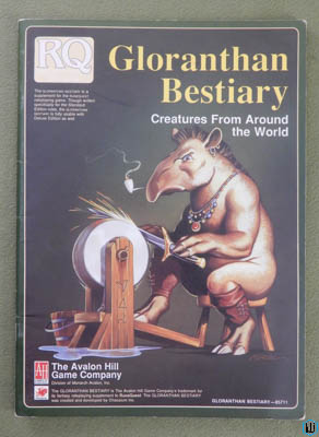 "LORDS OF TERROR is a RuneQuest Gloranthan campaign supplement. Complete cult descriptions of seven chaotic cults (Primal Chaos, Malia, Bagog, Thed, Krjalk, Pocharngo and Krarsht) are illustrated through passages from "The Reminisences of Faulis Longvale," an epic saga of treachery, horror, and heroism in the great war between the Orlanthi and the chaotic minions of Ralzakark, enigmatic sovereign of Dorastor, the Land of Doom. This companion volume to DORASTOR: LAND OF DOOM is an essential reference for all Gloranthan campaigns. Each cult description is accompanied by a major NPC - elaborate, fully-detailed examples of the fertile excesses of chaos worshipers - and several scenario schemes for adapting these grotesque antagonists to your campaign. Savor the unappetizing new rules for disease, tainted spirits, and chaotic features. Now the Servants of Chaos are more noisome and repulsive than ever before! Learn the lurid mysteries of the chaos cults exposed in numerous delicious tracts and testaments - each revealing Secrets That Man Was Not Meant to Know." 1994 ... Greg Stafford & Sandy Petyersen & Stephen Martin ... 96 pages ... AH 8595 ... ISBN 1560380845 Check Wayne's Books Inventory ![]() Gloranthan Bestiary: Creatures From Around the World