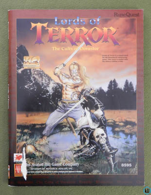 "In Chaos and Darkness the seed of corruption germinates, and propels its shoots into the light. In the fertile River of Cradles valley, cradle of civilized Prax, golden fields of barley glow in the sun. But on the Borderland, the frontier between civilization and the arid wastes, the servants of the dark cults hide their works from sight, and hatch the plots that burst forth like worms from the hearts of earth and men. Shadows on the Borderland, a Gloranthan campaign supplement for the RuneQuest roleplaying game, features an 80-page booklet, a 24-page GM Reference Pullout with major NPCs and player handouts, and two full-color pullout maps. In addition to a complete cult description for Thanatar, the Severed God, Shadows on the Borderland contains three scenarios ready for play: Gaumata's Vision Dyskund Caverns A Tale to Tell" 1993 ... Michael Dawson & Ken Rolston & Jon Quaife & Paul Jaquays & Sandy Petersen & Greg Stafford & Martin Crim & Roger Raupp (cover) ... 80 + 24 pages + map ("High Holes Caves") + map ("Dyskund Caverns") + map ("Black Rock Village") ... AH 8594 ... ISBN 1560380624 Check Wayne's Books Inventory ![]() Lords of Terror: The Cults of Dorastor