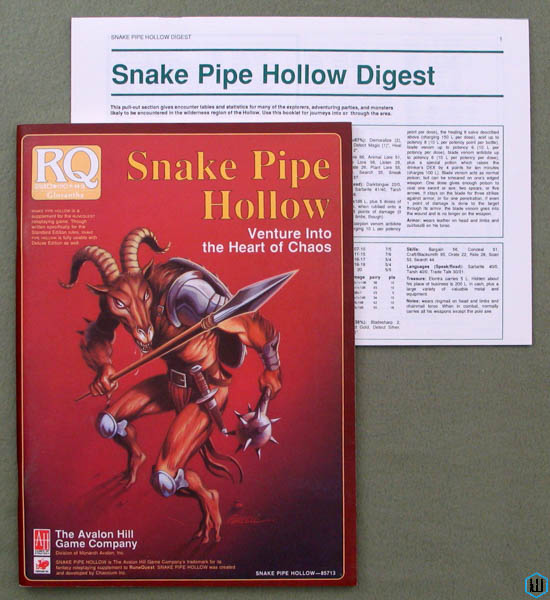 "THE GLORANTHAN BESTIARY contains more than 60 entries, excerpted from the ancient Compendium of Species. It includes descriptions, game statistics, and innumerable notes for each creature. Additionally, many entries are accompanied by a detailed illustration, and every two-page spread contains a world map showing population distributions of the accompanying entries. The GLORANTHAN BESTIARY is written for Standard Edition RuneQuest. All materials used from Deluxe Edition are reproduced in this book. Of course, the GLORANTHAN BESTIARY can be used with Deluxe Edition RuneQuest." 1988 ... Sandy Petersen & Greg Stafford ... 48 pages ... AH 85711 ... ISBN 0911605606 Check Wayne's Books Inventory ![]() ![]() Apple Lane: Save the Hamlet from Scurrilous Scoundrels "WHITEYE THE BANDIT STRIKES AGAIN! APPLE LANE, SARTAR In a particularly vicious pre-dawn attack, the notorious bandit Whiteye and his trollkin gang raided several farms in the Apple Lane region without warning or apparent cause. Whiteye has long been a nuisance to merchants, farmers, and travelers-at-large. Despite previous attempts at his capture, the wily bandit always has eluded Sheriff Dronlan's men, retreating to his secret hideout located among the numerous hills in the region. The sheriff, vowing "This time, that loathsome troll has gone too far," is assembling a posse, and offers a sizable reward for Whiteye's capture, dead or alive! APPLE LANE is a book of adventures for the RuneQuest roleplaying game. It contains two adventures (Gringle's Pawnshop and The Rainbow Mounds) written especially with the new RuneQuest gameplayer in mind, though sophisticated enough to enthrall even the most experienced gamer. APPLE LANE includes an 11x17" center-stapled, pull-out floorplan of Gringle's and a pull-out digest of all necessary character and creature game statistics. APPLE LANE is written for Standard Edition RuneQuest. All materials used from Deluxe Edition are reproduced in this book. Of course, APPLE LANE can be used with Deluxe Edition RuneQuest." 1988 ... Greg Stafford ... 40 pages + stat booklet + fold-out map ... AH 85712 ... ISBN 0911605614 Check Wayne's Books Inventory ![]() Snake Pipe Hollow: Venture into the Heart of Chaos