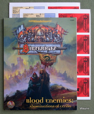 "Otto van Riede, captain of the Brechlen, fixed his gaze on the pirate cog that fled before him. He'd combed the Krakennauricht for a week, searching for the Icedrake, and now he intended to run her to ground. His lookouts had sighted the cog an hour after sunrise, beating her way into the bitter north winds. Van Riede had immediately turned in pursuit. Now the cog was only three or four cable lengths ahead and quickly racing into dangerous shallows. Van Riede smiled; the pirate vessel would have to turn and fight or run herself aground. "Sound general quarters," he ordered. "Archers to their stations! Clear the catapults! And ready a boarding party!" As his officers and crew clattered to their stations, readying the Brechlen for a fight, van Riede folded his arms and nodded. "Keep an eye on her, helm. She'll be turning any moment now..." Every land in Cerilia depends on the sea for military strength and trade. Many times, the quality of a regent's fleet and the naval power at his command prove the deciding factors in his success or failure as a ruler. This supplement expands the Birthright domain and War Card rules to handle sea travel and combat. Players can use the sample navies included for Anuirean, Khinasi, and Rjurik kingdoms as guidelines to tailor fleets to meet the needs of their own domains. Special maps illustrating the maritime areas surrounding Cerilia make it easy to add a naval dimension to any campaign. The Birthright Naval Battle Rules contain: The Seas of Cerilia, 16-page book detailing the rules for naval battles in the BIRTHRIGHT game, including sea movement, ship types, naval armament, sea trade routes, and battles on the water. A set of 51 naval War Cards featuring game statistics for the vessels of all the lands of Cerilia, as well as special wind cards governing movement at sea, and cards describing naval war magic. Counters for indicating crew capacity and ship movement rate. A full-color, poster-sized naval battle mat for ship-to-ship combat. (These naval battle rules first appeared in the Cities of the Sun campaign expansion. If you already own that product, it is not necessary to purchase this one.)" 1996 ... Rich Baker ... TSR 3134 ... ISBN 0786906286 Check Wayne's Books Inventory ![]() Blood Enemies: Abominations of Cerilia