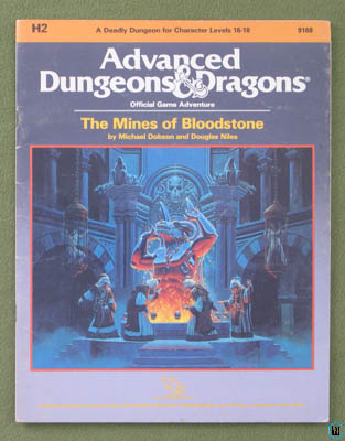 See my deep-dive into this set: BATTLESYSTEM (1985): A Collector’s Guide to the mass combat rules for Advanced Dungeons & Dragons "The first BATTLESYSTEM Supermodule from TSR, Inc! The tiny village of Bloodstone Pass is menaced by an army of thousands of brigands -- orcs, goblins, giants, and human renegades led by a powerful assassin. Outnumbered and helpless, the villagers must pay tribute in gold, food... slaves. Two villagers have travelled far to find aid for their people. They have turned to you, brave and powerful adventurers, as their only hope. They cannot afford to pay more than a few silver pieces a day, but their need is great. You are invited to save the people of Bloodstone Pass. Can you organize a defense, train and equip the peasants, recruit allies, gather intelligence... and win the war? BLOODSTONE PASS is an exciting good-aligned, high-level (15+) adventure that combines roleplaying with the thrill of mass combat. A complete 3-D ADVENTURE FOLD-UP village makes the battle come alive!" Contains: 32-page book, 24-page book, 104 die-cut counters (1 half-sheet: 9122XXX1201), 12 3-D fold-up sheets Counters have a reddish-tinted print (the original Battlesystem counters have a brown-tint print). 1985 ... Douglas Niles & Michael Dobson ... TSR 9122 ... ISBN 0394548566 / 0880381221 Noble Knight | DriveThruRPG (PDF) ![]() The Mines of Bloodstone (H2)