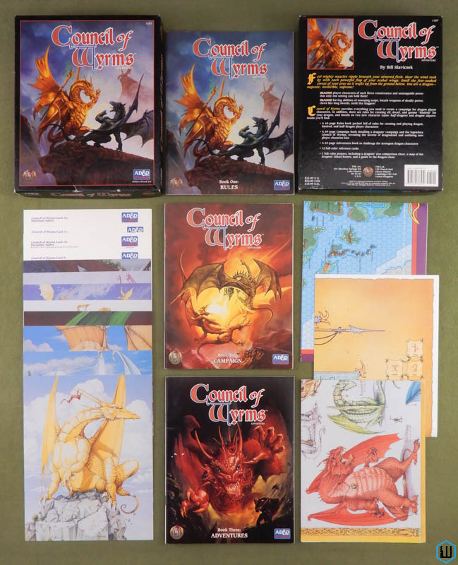 Monster Deck art is from the Monstrous Manual. Treasure Deck art ?. Location Deck art by Valerie Valusek. CONTENTS: * 16-page booklet (1090XXX1901) * 216 cards (108 Location, 54 Treasure, 54 Monster) * 3 cardstock sheets of dungeon accessories, meant to be cut (1090XXX0501, 1090XXX0502, 1090XXX0503) * single-page adventure hooks sheet (3rd through 5th level adventures; 4 adventure seeds each level) * 6 polyhedral dice -Wayne "Deal a dungeon? Deal a castle? Deal rooms with magical items, monsters, and danger lurking behind every table, box, and bookcase? The AD&D CARDMASTER Adventure Design Deck is an exciting new tool for DMs, and a thrilling new game for players. DMs will use the Adventure Design Deck to create dramatic settings for their adventures. Players can use Cardmaster to go a-questing with a DM. Even solo adventures are possible, just by shuffling the cards. 108 Location Cards depict unique and mysterious rooms and corridors on three dungeon levels. And on all levels are treasures to be found and monsters to be conquered. The Treasure Deck contains 54 cards full of loot and magical items. Explore each room for treasure, but beware of traps! And beware of the 54 different monsters with their own traps and snares, nesting in their own Deck. They are waiting for you... and some of them are hungry!" 1993 ... Rich Borg ... TSR 1090 ... ISBN 1560766123 Check Wayne's Books Inventory ![]() ![]() First Quest: The Introduction to Role-Playing Games "Join the heroes who find epic adventure with the First Quest™ audio CD game, the first interactive audio CD role-playing game ever created. Play its audio CD and hear monsters, magic, and mysterious dungeons spring to life. As the CD's interactive adventures, sound effects, and music ring forth, you and your friends play fighters, wizards, clerics, and thieves. Treasure, magic, and glory await. But beware! So do deadly creatures. Now everyone can play the Advanced Dungeons & Dragons® game! The First Quest CD audio game is the fastest, easiest way you can play the AD&D® game. Everything you need to get off to a great start is here! The First Quest audio CD game contains: * The audio role-playing CD featuring over 60 minutes of digitally recorded soundtracks, in its case * 6 plastic player character miniatures with a hero card for each * Dungeon Master® Screen and adventure book * Rulebook and 2 spell books * Full-color book of monsters and treasures * Full-color double-sided dungeon map * Player aid/character sheet card and town map card * Dramatic wall poster * Plus 7 adventure dice" 1994 ... TSR 1105 ... 1560768444 Check Wayne's Books Inventory ![]() These two late-run AD&D box sets appear quite different, but they are very much related. FIRST QUEST and INTRO to AD&D, compared side-by-side in photos over at my Game Gallery blog. AD&D 2e morphs graphically into 2.5e. Enjoy! -Wayne FIRST QUEST (1994) and INTRO to AD&D (1995): What a Difference a Year Makes ![]() ![]() Introduction to Advanced Dungeons & Dragons Game [BOX SET] CONTENTS: * Player Handbook (32 pages) * Dungeon Master Guide (64 pages) * Monstrous Manual (32 pages) * Dungeon Master Screen * Map (2 sides: Tomb of Damara / House on Harrow Hill) * Play cards, including 6 hero cards * Audio CD * 6 plastic figures * 7 dice 1995 ... TSR 1134 ... ISBN 0786903325 Check Wayne's Books Inventory ![]() ![]() Council of Wyrms [BOX SET] Council of Wyrms: THE OLD SCHOOL DRAGONS "IMAGINE player characters of such fierce countenance and unstoppable power that only one setting can hold them! IMAGINE having abilities of sweeping scope, breath weapons of deadly power, claws like long swords, teeth like daggers! Council of Wyrms provides everything you need to create a campaign for dragon player characters. In addition, there are rules for creating elf, dwarf, and gnome 'kindred' for your dragon, and details on two new character types: half-dragons and dragon slayers." ... Inside you'll find: * A 64-page Rules book packed full of rules for creating and playing dragon, kindread, and half-dragon player characters * A 64-page Campaign book detailing a dragon's campaign and the legendary Council of Wyrms, revealing the secrets of dragonking and outlining new player-character kits * A 64-page Adventures book to challenge the strongest dragon characters * 12 full-color reference cards * 3 full-color posters, including a dragon's size-comparison chart, a map of the dragons' island home, and a guide to the dragon clans." 1994 ... TSR 1107 ... ISBN 1560768576 Check Wayne's Books Inventory ![]() The Complete Starter Set: Advanced Dungeons & Dragons Game 2E