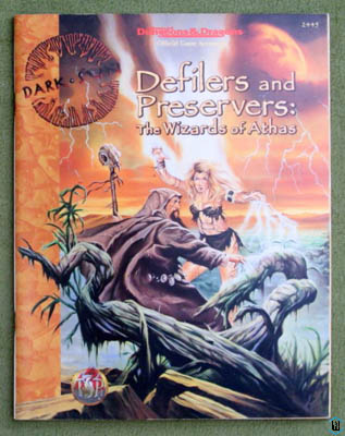 "The relentless passage of time sweeps across the burning plains, and the world beneath the crimson sun changes in its wake... The Dragon of Tyr is gone, his evil scattered on the scalding winds. Torrential rains fall over the Sea of Silt, spinning off deadly storms that can strike anywhere in the Tablelands with only a moment's notice. Violent upheaval rocks the city-states of Raam, Draj, and Balic after the deaths of their sorcerer-kings. A new age has dawned on Athas, but will it be an age of restoration—or of destruction? Beyond the Prism Pentad summarizes the key events from the Prism Pentad novel series and role-playing game products and updates all Dark Sun campaigns in anticipation of the revised campaign setting, Dark Sun: A New Age, featuring: • The key events of the first 10 years of campaign time, with a detailed timeline of historical events. • Updates and details on the changes in the world, including the seven city-states of the Tyr Region. • Statistics for the major personalities, including Rikus, Sadira, and the remaining sorcerer-kings. • A short adventure to tie player characters into the events of the climax of the Prism Pentad series. What forces have seized control of Raam and Balic? Who is the real power behind Draj? How are the citizens of iyr handling their second decade of freedom? The answers to these questions — and many more — are awaiting you." 1995 ... Bill Slavicsek ... 32 pages ... TSR 2441 ... ISBN 0786903082 Check Wayne's Books Inventory ![]() Defilers and Preservers: The Wizards of Athas