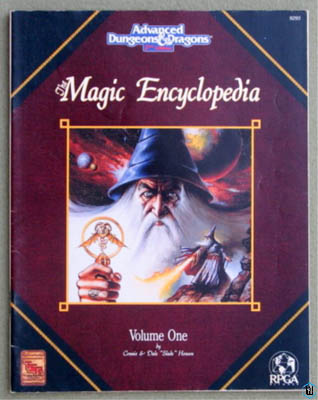 "Did you ever wonder what a phylactery is? Do you know what the difference between a cloak and a robe is? The Magic Encyclopedia answers these questions with succinct definitions of every type of item found in a magical treasure hoard, and every definition has an illustration. The list of definitions in Volume Two runs from Goggle to Zwieback, and completes the list begun in Volume One. The listing includes an experience point value and a gold piece sale value for each item. At last, you'll know exactly what every bauble in any hoard is really worth. The listing also identifies the product where the item is described and the page number where you can find it. A complete list of those products (current through December, 1991) is also provided." 1993 ... 96 pages ... TSR 9421 ... ISBN 1560765631 Check Wayne's Books Inventory ![]() ![]() Encyclopedia Magica series, 1995 & 1999 printings. Spines. The original bible-cover series got a second printing in 1996. -Wayne ![]() Encyclopedia Magica Volume One: A-C