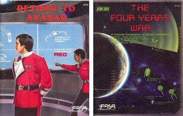 Other Star Trek game publishers: Last Unicorn Games & Decipher ~ Fan-written Star Trek accessory books ~ Star Trek releases by West End Games FASA Star Trek: Core Rules and Sourcebooks ~ Adventures BROWSE MY STAR TREK ITEMS CURRENTLY IN STOCK ![]() Core Rules and Sourcebooks![]() Star Trek: The Role Playing Game (1st Edition) [BOX SET] "Space... the final frontier. These are the voyages of the Starship Enterprise. Its five-year mission: to explore strange new worlds, to seek out new life and new civilizations, to boldly go where no man has gone before... Now you can join the Enterprise; all that is required is right here. Included in the game is: 1. The Basic Rule Book: This 128-page, two-color, 8½ x 11 inch book contains all of the rules needed to create and play a Star Fleet character. Rules for man-to-man combat, starship combat, planetary generation, and culture and alien generation are also included. This book is heavily illustrated with pictures from the TV series. 2. Adventure Book: This 48-page, 8½ x 11" book contains three introductory adventures and descriptions of the Enterprise and Klingon D-7 deck plans. 3. Deck Plan Book: This 80-page, 8½ x 11 inch pull-apart book contains scaled deck plans of the U.S.S. Enterprise and the Klingon D-7 class Battlecruiser. The scale of these plans is 1 inch = 6 meters. Also included with this book are several reference sheets used with the starship combat system. 4. Starship Combat Hex Grid: This 22½ x 33 inch hex grid is used with the starship combat system. 5. 112 Illustrated Counters: One side of these counters is used with the starship combat system. The other side depicts figures and can be used with man-to-man combat." The 1st print had only 112 counters and different, B&W box bottom graphics. -Wayne 1983 ... FASA 2001 ... ISBN 0425066711 Check Wayne's Books Inventory ![]() ![]() Star Trek: The Role Playing Game (Deluxe Game: Second Edition) [BOX SET] This set was released in 1983, and re-released in 1986 with modifications. 1983 "Deluxe Limited Edition" Contents : Star Fleet Officer's Manual (40 pages) Cadet's Orientation Sourcebook (40 pages) Game Operations Manual (80 pages) Adventure Book / Starship Recognition Book (35+17 pages) - A peculiar flip book meant to be read in both directions. Three adventures on one side (Ghosts of Conscience; Again Troublesome Tribbles; In the Presence of My Enemies), and stats on the Constitution Class Heavy Cruiser & Klingon D-7 Class Battlecruiser on the other side. Book of Deckplans (Constitution Class Heavy Cruiser & Klingon D-7 Class Battlecruiser) - This was dropped from the 1986 set. 4 small booklets making up the starship combat system (Introduction; Basic Starship Tactics; Advanced Rules; Starship Data and Combat Charts) charts booklet 1 hex space combat mapsheet 76 hex starship counters 2 large hex planet counters 112 1/2" square fire control counters 1986 "Deluxe Game" Contents: Star Fleet Officer's Manual (40 pages) Cadet's Orientation Sourcebook (40 pages) Game Operations Manual (48 pages) Starship Tactical Combat simulator (80 pages) Master Control Book (80 pages) charts booklet 1 hex space combat mapsheet 152 hex starship counters 4 large hex planet counters 112 1/2" square fire control counters The boxes have slight graphical differences, the most notable being the logo. The 1983 set uses the early FASA logo, what I call the "Klingon" logo. The 1986 set uses the later, simpler FASA word logo. -Wayne CONTENTS (Official): Star Fleet Officer's Manual (40 pages) Cadet's Orientation Sourcebook (40 pages) Game Operations Manual (80 pages) Starship Combat Role Playing Game (64 pages) 1983, 1986 ... FASA 2001 ... ISBN 0931787017 Check Wayne's Books Inventory ![]() ![]() Star Trek: The Role Playing Game (2nd Edition) [BOX SET] CONTENTS: "Star Fleet Officer's Manual: This 40-page book contains information on how to play the game. With it, you can create and train your own Star Fleet Officer as well as direct his actions in ground-based adventures. Included are an introduction and a glossary for players new to role-playing games. Cadet's Orientation Sourcebook: This 40-page book contains information about the Star Trek universe. It includes illustrated sections on the races and governments in the known universe, as well as photo-illustrated sections on the organization and equipment of Star Fleet. For players new to Star Trek, there is a time line of events and a glossary of Star Trek terms. Game Operations Manual: This 48-page book contains all the information necessary for designing and running games. It has sections on designing adventures and presenting them to players. There are sections on judging character generation and actions planetside and in space." 1985 ... FASA 2004 ... ISBN 0931787041 Check Wayne's Books Inventory ![]() Gamemaster's Screen