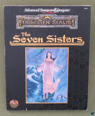 "For many years, Evermeet has remained a mystery, known only as the elves' place of refuge. So far, details about the island itself, its geography, rulers, and society have been sketchy. It is known that Evermeet is protected by illusory magic, that ships lose their way or vanish mysteriously if they approach the isle, and that the elven navy is the finest in the realms. Past publications have also revealed that Evermeet is ruled by Queen Amlaruil, and that her husband Zaor was murdered decades ago. Beyond this, little is known. The Elves of Evermeet attempts to investigate and explain the inner workings of the elven island, and develop the realm as a setting for FORGOTTEN REALMS adventures. Until now, Evermeet has been reserved exclusively for the elves and officially closed to humans, dwarves, and other races. But this product will help you work Evermeet into your campaign and allow other PC races to visit, or at least interact, with the mysterious island. Included are: • new elven magic (for High Mages), • elven NPCs, • tips on playing Evermeet elves, • gods and goddesses of the island, and • adventure ideas for your own campaign!" 1994 ... Anthony Pryor ... 128 pages ... TSR 9430 ... ISBN 1560768290 Check Wayne's Books Inventory ![]() The Seven Sisters