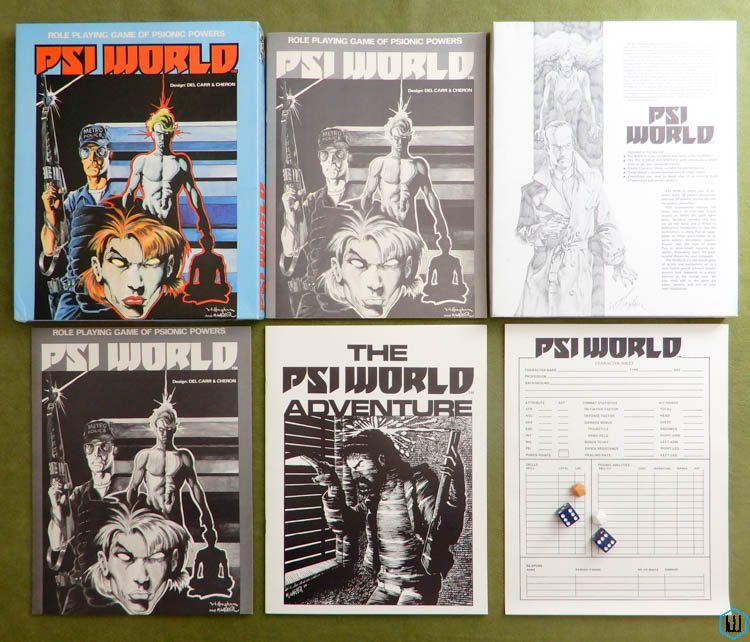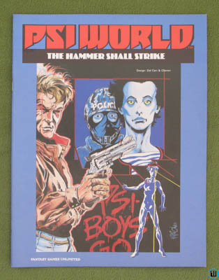 "This package contains the PRIVATEERS AND GENTLEMEN campaign around the Barbary city of Djerba on the North African Coast. Player-Characters must deal with a major French force that has broken the British blockade of French ports, the French garrison at Djerba, and the danger of he French squadron in Djerba harbor making a sortie or being joined by the French Mediterranean fleet. At stake is the British blockade of Egypt, the recapture of Malta from the French, the protection of Sicily, and even British control of the Mediterranean." 1984 ... 20 pages ... FGU 5403 Check Wayne's Books Inventory ![]() PSI World![]() PSI World [BOX SET] "An exciting new role playing game in which characters use or deal with awesome psionic powers in a near future setting. PSI WORLD offers over seventy-five different skills, twenty-five psionic disciplines, and over ninety specific psionic abilities. The gamemaster chooses the nature of the near future society, and with the input of the players, selects the style for their campaign. There are two options: The Government has attempted to gain dictatorial powers and uses the Psis as scapegoats to distract public attention from the Government's illegal grab for power. The Psis are a true threat to democratic rule as they use their powers to gain unfair advantages in business, politics, and all aspects of daily life. Players take the roles of members of the Psi Police to protect the public from this psionic menace. Be a Psi and control awesome powers of the mind! Protect the innocent from those with great powers as a member of the Psi Police! The choice is yours. Seek adventure in this fast paced game of action and excitement in a near future setting wherein psionic powers have appeared in a small portion of the human race. The only limits are your imagination! PSI WORLD includes complete and easily understandable rules (32 pages), the PSI WORLD ADVENTURE with introductory adventures to get your campaign started (20 pages), cardstock Gamemaster's Screen (3 panel double sided), and a master cardstock character sheet suitable for photocopying (character sheet is single sided). Everything needed to begin your PSI WORLD campaign is included in the boxed set." The box sets also originally came with 2d6 and 2d10 (the strange kind that are actually tiny d20s numbered 1-10 twice). A great review and how-to-play: FRINGE REVIEW: PSI WORLD -Wayne 1984 ... Del Carr & Cheron & Bill Willingham (art) ... FGU 2301 ... ISBN n/a Check Wayne's Books Inventory ![]() PSI World: The Hammer Shall Strike