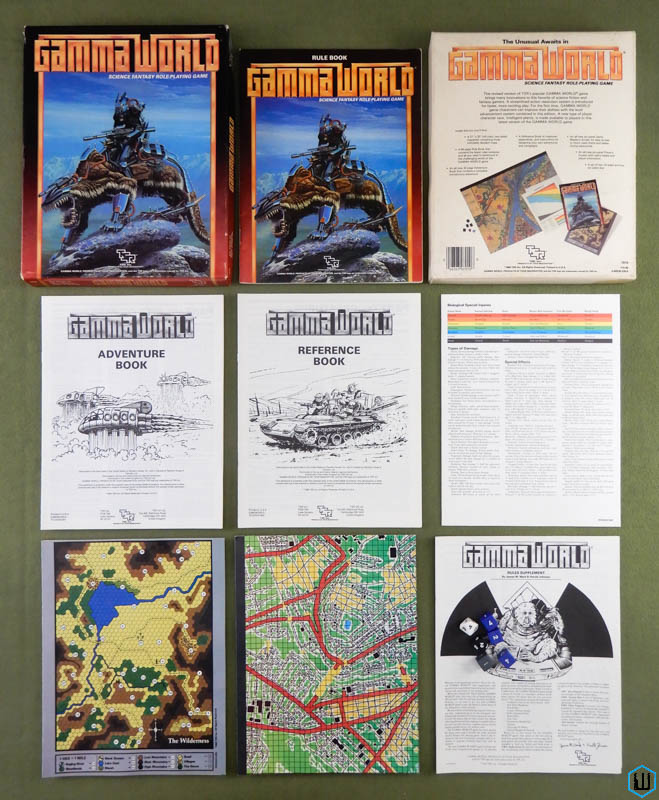 Written by James Ward, Metamorphosis Alpha is the direct ancestor of Gamma World. Radiation, robots, wild mutations, strange lifeforms, it all started here on the starship Warden. Fiction with a similar background as M.A. include: * Orphans of the Sky (Robert Heinlein) * Non-Stop (Brian Aldiss) * Captive Universe (Harry Harrison) Almost twenty years after the original Metamorphosis Alpha TSR published an updated version -- Metamorphosis Alpha to Omega -- very similar in feel to Gamma World, 4th edition. -Wayne "Have you ever encountered a moose with quills? Or a teleporting woodpecker with a double brain and a poison beak? How about a nearly invincible jaguar, complete with the ability to change its body density and emit a sonic shriek, but which fears birds? These are but a small sampling of the mutations which could inhabit the many worlds of METAMORPHOSIS ALPHA. A vast starship, a virtual world in itself, carrying colonists, livestock, and the flora and fauna of Terra is struck by a cloud of an unknown form of radiation while enroute to a distant star. Chaos reigns when the radiation kills most of the crew, and in the ensuing madness the knowledge of what the ship is and where its destination lies is lost to the survivors - and there are many survivors. Intelligent mutated animals and plants now populate the vessel, and these compete or perhaps cooperate with the humans aboard. In METAMORPHOSIS ALPHA, you are aboard the stricken starship and struggling to survive, trying to gain knowledge of the strange devices and mechanical apparatus of the vessel, attempting to learn the secrets of the strange world you inhabit. As a player, you may be a human or mutant - human or otherwise. Your course is up to your skill and imagination. METAMORPHOSIS ALPHA is a role-playing game in the grand tradition of DUNGEONS & DRAGONS. If you enjoy the worlds of medieval swords and sorcery, you will love what you find in the fantastic and fascinating worlds of science fiction!" 1976 ... 32 pages ... TSR SF18-R / 3001 (later printings) Check Wayne's Books Inventory ![]() 1st Edition: Classic (1978-1982)![]() Gamma World 1st edition [BOX SET] Peoples of the world - you appear bent upon the destruction of a civilization that has taken centuries to build, and the extinction of life on earth. And so began TSR's Gamma World game in 1978: A rich post-holocaust science fantasy setting. A complete boxed set will include the rules book and a large campaign map of ruined North America. 1978, 1981 ... James M. Ward & Gary Jaquet ... TSR 3002 ... ISBN 0394518799 Check Wayne's Books Inventory ![]() Referee's Screen and Mini-Module
