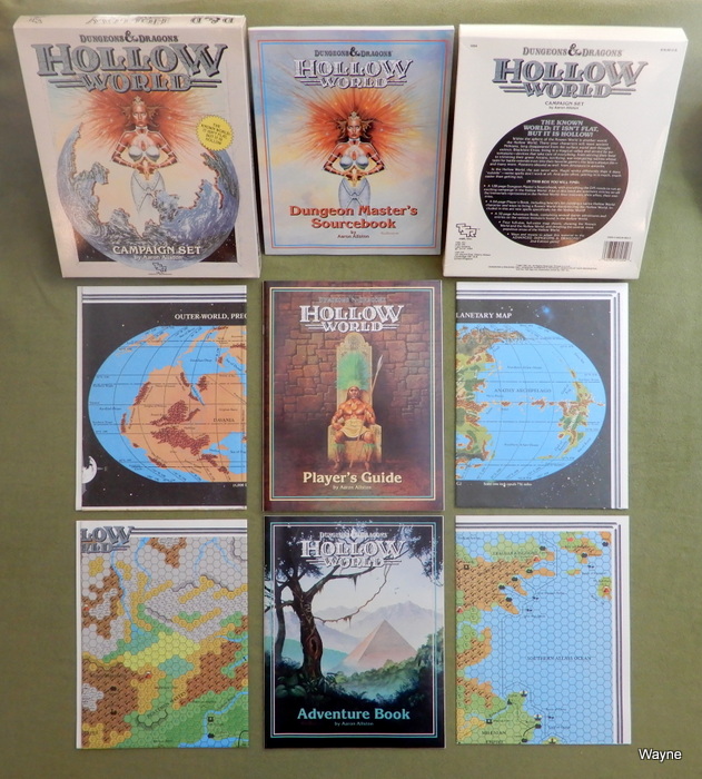 D&D Central D&D Accessories (AC series) | D&D Accessories (other) | D&D Modules (B series) | D&D Modules (C-D) | D&D Modules (I-O) | D&D Modules (X series) | D&D Modules (other) | Creature Crucible | Gazetteer | Mystara | Non-TSR D&D BROWSE MY DUNGEONS & DRAGONS ITEMS CURRENTLY IN STOCK BROWSE MY HOLLOW WORLD ITEMS CURRENTLY IN STOCK ![]() ![]() "TSR was always a target for criticism. The industry juggernaut that turned DUNGEONS & DRAGONS into a synonym for roleplaying was rightly criticized for its boneheaded business decisions, and its treatment of the rest of the roleplaying community as the enemy in some kind of twisted, scorched-earth warfare. On the other hand - and this can't be denied, even by TSR's staunchest critics - the company came out with some really cool stuff. Case in point: HOLLOW WORLD. ![]() ![]() Hollow World Campaign Set I've seen the maps in this set printed two different ways: As 4 single-sided separate mapsheets, and as 2 double-sided maps. MAPS: 1054XXX0701 - Southern Iciria 1054XXX0702 - Northern Iciria 1054XXX0703 (no code) - Outer World Planetary Map. Hollow World Planetary Map. Arctic and Antarctic Maps. 1054XXX0704 - Outer World Postcataclysmic Map. Outer World Precataclysmic Map. Hollow World Diagram. Local Migration History. Box lid date: 6/90 Many more photos at my Game Gallery blog post on HW! -Wayne "Within the sphere of the Known World is another world, the Hollow World. There your characters will meet ancient Nithians, long disappeared from the surface world and thought extinct: Blacklore Elves, living in a magical valley and served by automatons --devices that take care of everything, from serving their food to trimming their grass: Azcans, terrifying, war-mongering natives whose taste for battle extends even into their favorite game -- the losers always die -- and many more. Monsters abound as well, from dinosaurs to aurochs. In the Hollow World, the sun never sets. Magic works differently than it does "outside" -- some spells don't work at all. And quite often, getting in is much, much easier than getting out. * A 128-page Dungeon Master's Sourcebook, with everything the DM needs to run an exciting campaign in the Hollow World. Also in this book are extensive entries on all the Immortals represented in the Hollow World: their interests, their allies, their enemies. * A 64-page Player's Book, including how-to's for creating a native Hollow World character and ways to bring a Known World character into the Hollow World. Included in this are new spells specifically for the Hollow World. * A 32-page Adventure Book, containing several starter adventures and entries on the various monsters found in the Hollow World. * Four full-size, full-color map sheets, showing the Known World and the Hollow World, and detailing the central, most populous areas of the Hollow World. * Ways and means to adapt this material to the Advanced Dungeons & Dragons 2nd Edition game!" 1990 ... Aaron Allston ... TSR 1054 ... ISBN 0880388625 Check Wayne's Books Inventory ![]() Nightwail (HWA1)