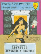 "The scenario assumes the players start at Alcastra's Tower. The party should contain at least one Cleric. The Judge may prefer to start them in Tassin's Wood or one of his own towns, allowing the players to pick up rumors about employment themselves. The objective of this scenario is the recovery of the Illhiedrin Book. For the players to accomplish this, they must take the information and items given them by Alcastra the Wizardess, and journey to the town of Tassin's Wood to find information concerning a long-dead Wizard. After that, they must clean Orcs out of a Tomb, obtain more information from there, and finally defeat a unique creature in order to recover the Book." 1981 ... Daniel Hauffe ... 32 pages ... JG 750 ![]() Portals of Twilight