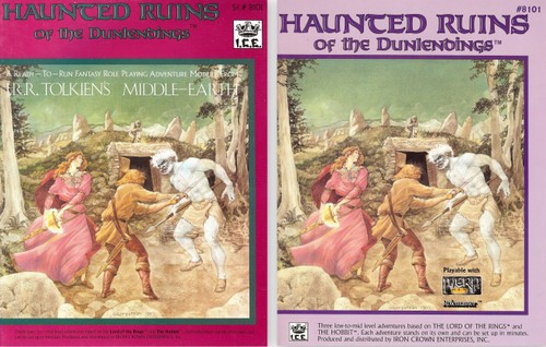 "This package details the High Pass of the Misty Mountains. Adventure into the depths of Goblin-gate, kingdom of the Great-goblin and the hiding place of Gollum, possessor of the One True Ring. Soar with the Great-eagles of Eagle's Eyrie, stroll the streets of Maethelburg, market of the upper Anduin, or battle Giants of the Misty Mountains. Cutting through the heart of the Misty Mountains is the High Pass, connecting Rivendell and Rhudaur to the ancient Dwarf-road running east through the dreadful forest of Mirkwood. Near the summit, Orcs have delved one of their infamous subterranean strongholds, known to its apprehensive neighbors as Goblin-gate. The strategic locale of Goblin-gate is an incalculable threat to the Free Peoples because of its proximity to Angmar and the Orcish capital of Mount Gundabad." 1985 ... Carl Willner ... 40 pages ... ICE 8070 ... ISBN 091579540X Check Wayne's Books Inventory ![]() Haunted Ruins of the Dunlendings