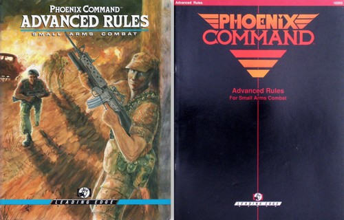 Leading Edge Games Mechanized Combat System ~ Other Military Role Playing Games BROWSE MY PHOENIX COMMAND ITEMS CURRENTLY IN STOCK A detailed, realistic combat system compatible with Living Steel, also by Leading Edge Games. ![]() ![]() Phoenix Command [BOX SET] BOX CONTENTS: 48-page, spiral-bound Combat System Rule Book, the 26-page, fully illustrated Modern Military Small Arms Weapon Supplement, 8 double-sided card stock Reference Tables, blank Character Sheets. There are actually 4 double-sided cards: * Game Sequence / General Reference Table * Movement Modifiers, etc (3) / Medical (7) * Offensive Fire (4) / Hit Chances, etc (5) * Hit Location and Damage (6, both sides) Ocasionally, I see 4 others as well: * Blunt Trauma Damage Table (8) / 3 Round Burst and Effective Minimum Arc Table (9) * Spotting Table (11) / Group Spotting Table (12) * Blind Fire, Weapon Damage, Smoke, Cover Table (10) / Disabling Injury, Leadership, Explosives Table (13) * Evasive Action Table (14) / General Reference Table -Wayne "Are you tired of your current small arms combat system? Tired of inconsistencies and rules that simply don't work? If so, we invite you to conduct a short test: Using your current small arms combat system, place the muzzle of a large caliber pistol between your character's eyes. Squeeze the trigger. Continue squeezing the trigger until he falls unconscious. Then have a friend put a band-aid over that nasty .45 caliber dent in his skull, and try not to get him shot too often in the week or two it takes to heal. Phoenix Command combines accurate simulation of gunshot wounds with detailed aiming and firing rules, and authentic modern weapon data to create a simple, fast-paced game with an incredibly realistic feel. Included are: • Modern Weapons, including over 140 of the latest: Pistols and Sub-Machineguns (M92F, MAC10, AKR, MP5KA4, etc.) Rifles and Machine Guns (M16A2, M249, AK74, G11, etc.) Grenades and Explosives (M67, M26A2, RGD5, RKG3, etc.) Grenade and Rocket Launchers (M79, M203, RPG7, etc.) Shotguns (SPAS12, B4-B, CAWS, Mossberg Bullpup 500, etc.) • Body Armor and Cover • Medical Aid • Initiative and Morale • Knockout and Disabling Injuries Phoenix Command provides a challenging and satisfying playing experience as a table top wargame, a modular combat system for your own role-playing game or with any other Leading Edge Game. (Look for Rhand Phoenix Command, the ultra high-tech role-playing game for this system!)" 1986 ... LEG 10200 Check Wayne's Books Inventory ![]() ![]() Phoenix Command [BOX SET] CONTENTS: * 56 page spiral bound rule book * 32 page Modern Military Weapon Data Supplement * Card Stock reference sheets * Blank character sheets "You race down the street toward the sound of gunfire. Up ahead, your teammates are pinned down, and you are their last chance. Your pulse pounding in your ears and your breathing ragged, you flip your Uzi to full auto. Suddenly you hear footsteps in the alley beside you. Uzi in hand, you turn to face your opponents. Your mind rushes — Should you fire immediately, or pause to aim? Choose now — The decisive moment is at hand. Phoenix Command is a revolutionary small arms combat system. Quick playing and extremely realistic, it is perfect for any Role-Playing situation, or for man to man modern wargaming. Phoenix Command puts you in the heart of the battle, and raises play to new levels of excitement and vitality. Beautifully illustrated, Phoenix Command contains over 140 modern military small arms, ranging from pistols to machine guns and rocket launchers. Also included are the only accurate rules for automatic fire, shotguns, and grenades. Phoenix Command is the ultimate simultaneous fire and movement system." 1987 ... LEG 10200 Check Wayne's Books Inventory ![]() Phoenix Command Small Arms Combat System