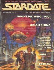 ARTICLES: The Right: Place by Victor Milan; The Winter Market by William Gibson; Room to Grow by Rudy Pucker; The Man Who Did Tricks with Glasa by Ron Wolfe; A Close Shave by Larry Tritten; Coming of Age in the Greenhouse by Somtow Sucharitkul; Revenge of 'Dear Ybba' by Larry Tritten; Doctor Who Role-Rlaying Game Section: Who's in Trouble by David Bischoff; Review: The Iytean Menace by George Andrews; Star Trek Role-Playing Game Material: Worlds of Treaty Exploration by Dale L. Kemper; The Dayen by Peter R. Rogan; The Klingon Mind Scanner by Mark Vaughan; Quartermaster Corps: Slip and Stick by Peter R. Rogan March/April 1986 ... 62 pages ... Associates International ![]() Stardate Magazine, Vol. 3, No. 1