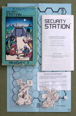 "A 31 ounce solid sterling silver dragon is hidden in the United States. Information needed to find the silver dragon is in THIS programmed fantasy adventure. The person who actually finds the silver dragon gets to keep it and claim a $10,000.00 CASH PRIZE from Metagaming. If it has not been found by September 1, 1985, a drawing will be held from cards in this adventure that have been mailed to Metagaming. Any of you might win. WARNING! TREASURE OF THE SILVER DRAGON is a programmed adventure suitable for solitaire or group play. To play this adventure as a game you will also need MELEE, MicroGame no. 3, and WIZARD, MicroGame no. 6. You don't have to play this adventure as a game to discover the silver dragon's hiding place. However, those who do play it will have a distinct advantage in understanding. Metagaming brings you a real live treasure hunt! This isn't just reading and playing about treasures. Perhaps you will be the first to decipher the clues and go get the silver dragon and win $10,000.00. It's all up to you. You may be the one to hold that dragon in your hands knowing you beat thousands to it. Introductory fantasy gaming for one to six players age 12 and up. Suitable for solitaire play. Includes rules & map." 1980 ... MG 3204 Check Wayne's Books Inventory ![]() Security Station (MicroQuest 5)
