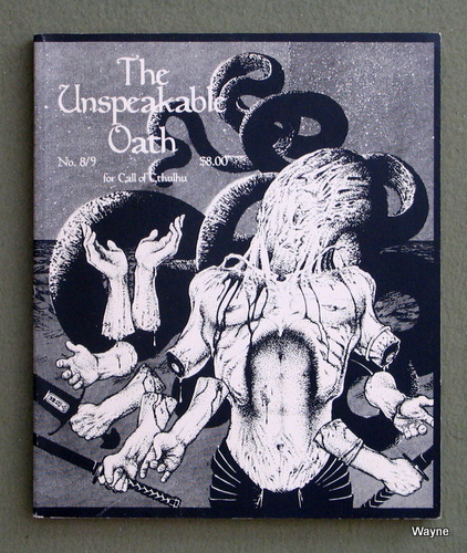 CONTENTS: The Dread Page of Azathoth, by John Tynes; Firearms in Call of Cthulhu, by John Crowe; Good Tidings from Shantak Claus; New for Cthulhu; The Ponape Predators, by Kevin A. Ross; The Road to Hali, by John Tynes; A Tale of Terror, by Steve Hatherley; Creating and Using Mythos Tomes, by John Tynes; Within You Without You, by John Tynes; Message in a Bottle, by John Tynes. 1990, 1991 ... 56 pages ... Pagan Publishing Check Wayne's Books Inventory ![]() ![]() Issue One printings I'm a bit uncertain about the printing history, but here's my take: * "Premiere Issue" - Gray-colored cover, digest-size (unlike all the UO mags that would follow). Winter 1990. Pictured above. I've only seen one of these thus far, so the premiere issue is quite rare. * Orange cover - Wider-format, almost a square. 2nd printing (assumed, not stated), December 1990. * Orange cover - 3rd printing, April 1991. Otherwise identical to 2nd print. More at my Games Gallery post -Wayne ![]() Unspeakable Oath, Issue 2