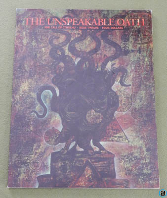 "This issue's cover is by artist Dennis Detwiller, depicting the arrival of the King in Yellow at the Court of Yhtill. Articles include the Mythos in colonial New England; Lovecraftian films and how to run better games by watching them; and a look at the island of Ponape. Two scenarios dealing with cults are included: in "Cold War" you play Ithaqua cultists in 1990s Toronto; "Two Minutes On High" puts the investigators between warring cults in 1920s New England." Fall 1994 ... 64 pages ... Pagan Publishing Check Wayne's Books Inventory ![]() Unspeakable Oath - Issue 12